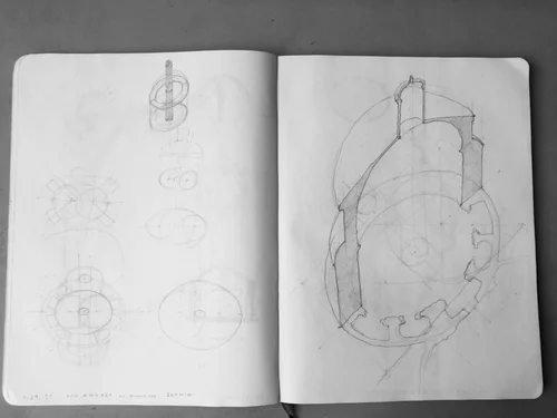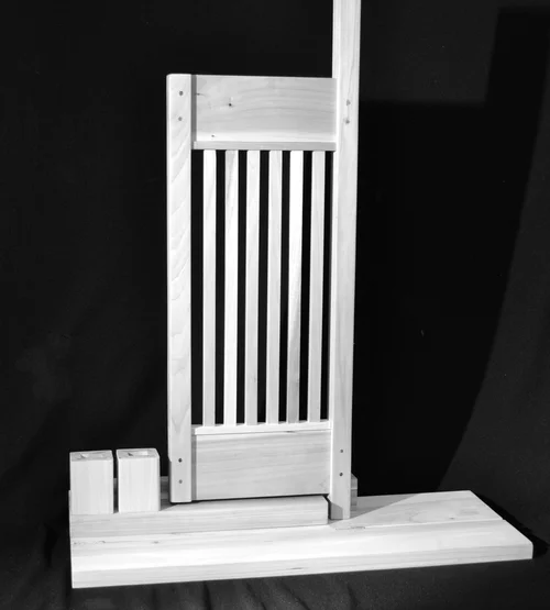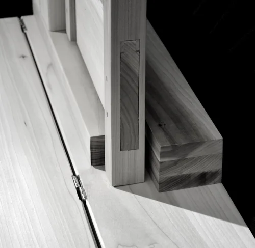 A variation on the traditional gate leg table, this flexible piece facilitates viewing and workspace for drawings. The hinged top could lean against a wall -- forming an inclined support for loose paper -- or open flat to function as an ample work surface. To conserve space, this table is designed to collapse. The two hinged halves of the top fold into the table's midsection and the gate legs swing inward. Particular emphasis is put on a hierarchy of pieces, where a strong sense of horizontality is obtained. Small decorative elements tie the whole piece together.